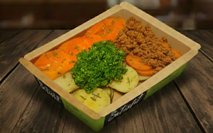 moída com arroz branco, feijão carioca, vagem e abobrinha |